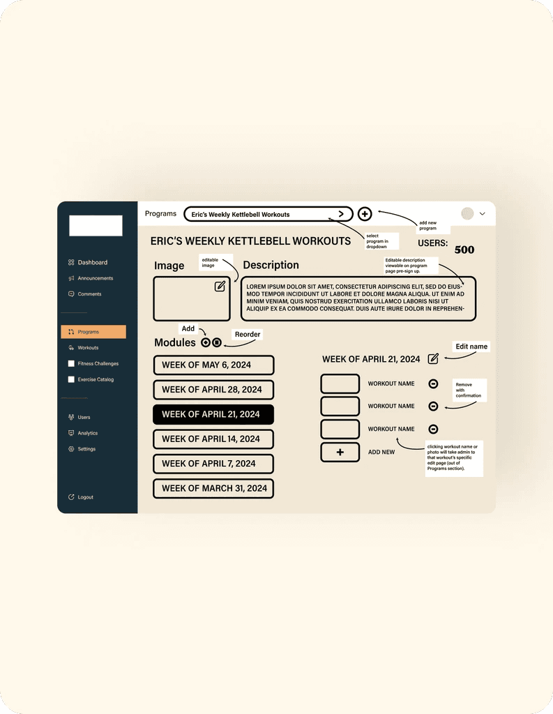 First, we looked at both sides of the problem. On one side, Eric was wasting time and effort with a clunky and inefficient app platform that limited his monetisation opportunities. On the other side, his paying members had to put up with a workout experience that was frankly sub-optimal. Our task was clear – build a custom no-code solution that’s effortless for Eric and his members to use. At least, until they start lifting.